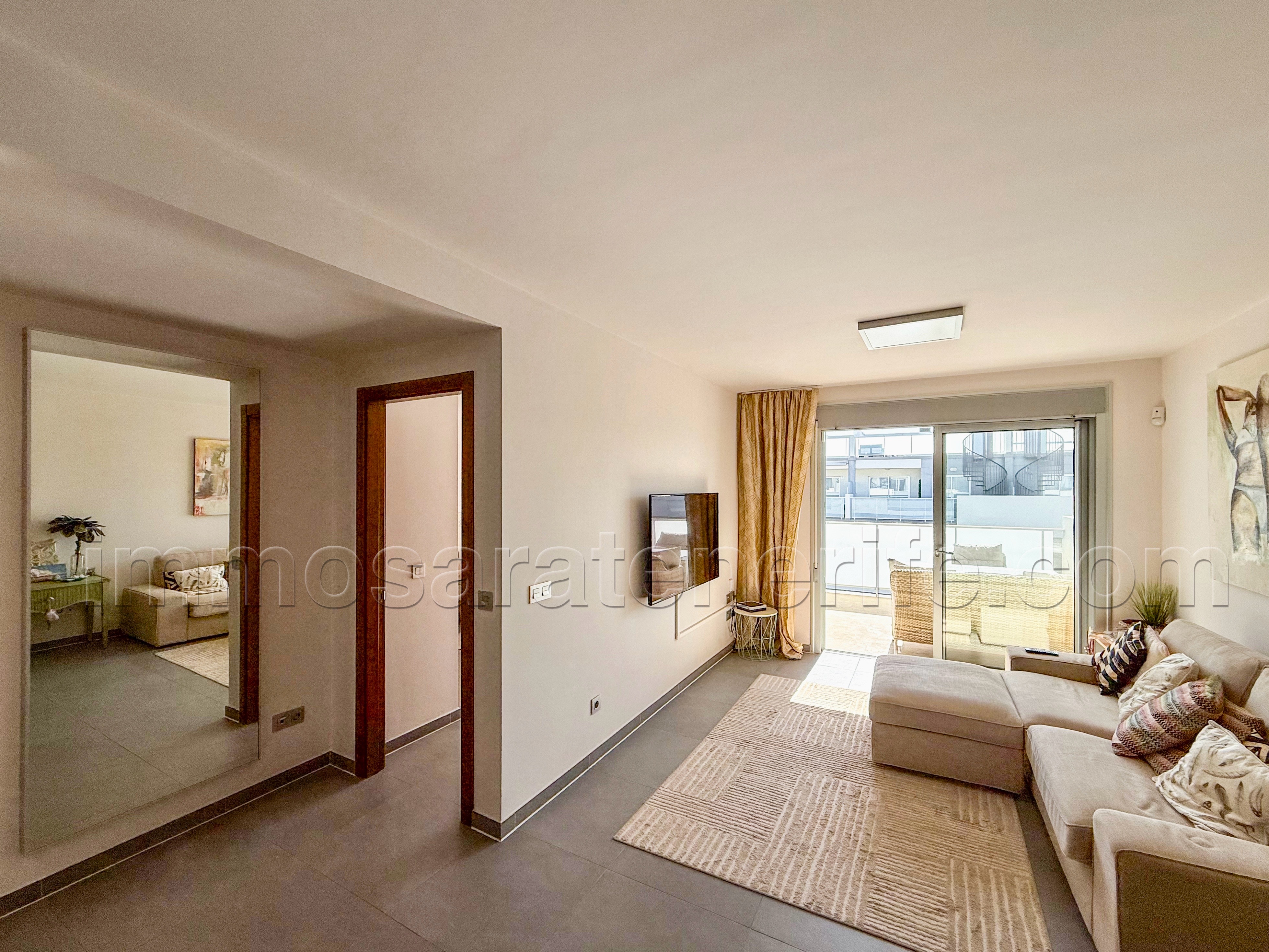 El salón da a la terraza con una escalera de caracol que da acceso a la azotea.