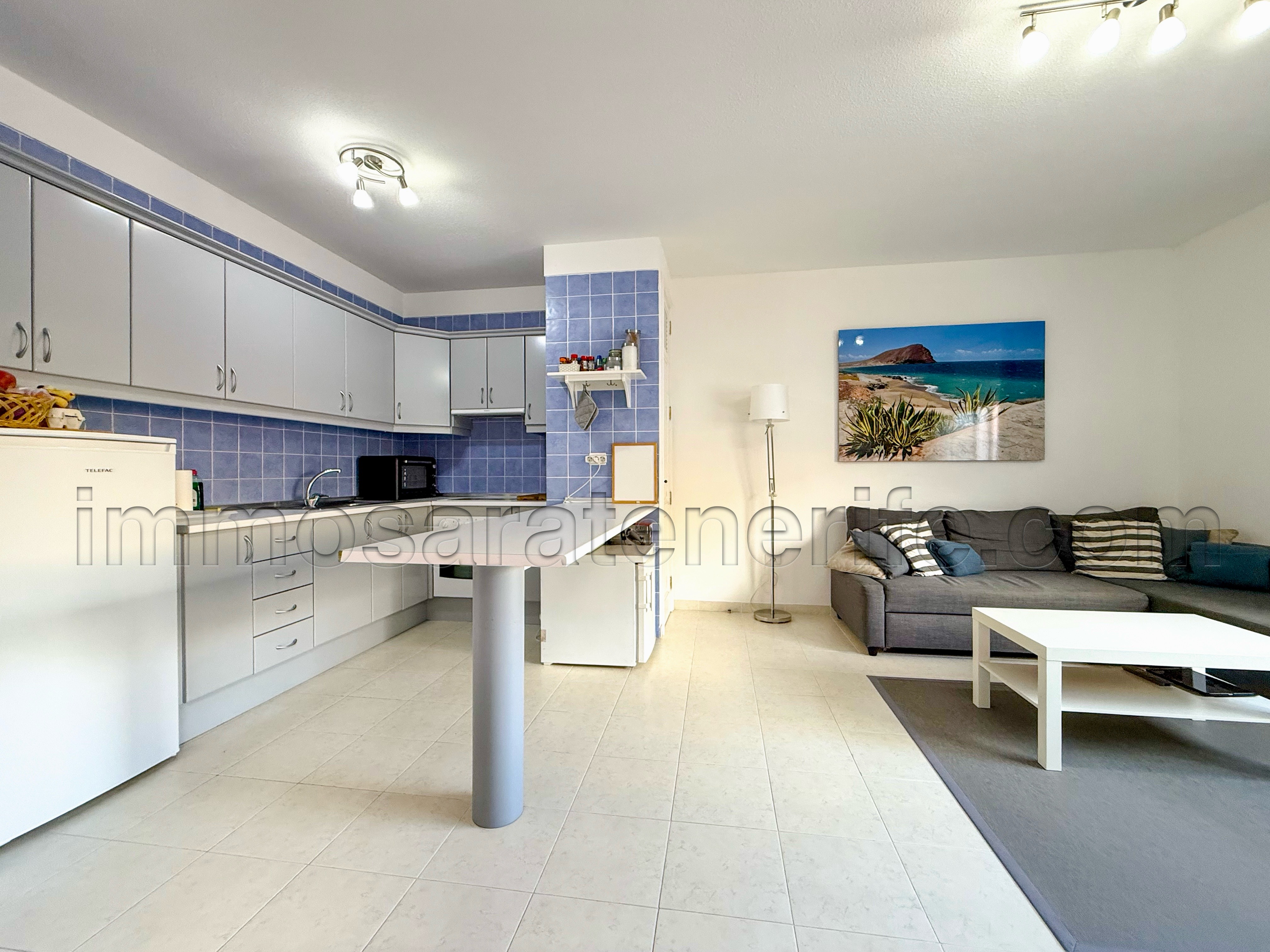 Er is een open keuken aan de woonkamer met uitzicht op het zwembad.