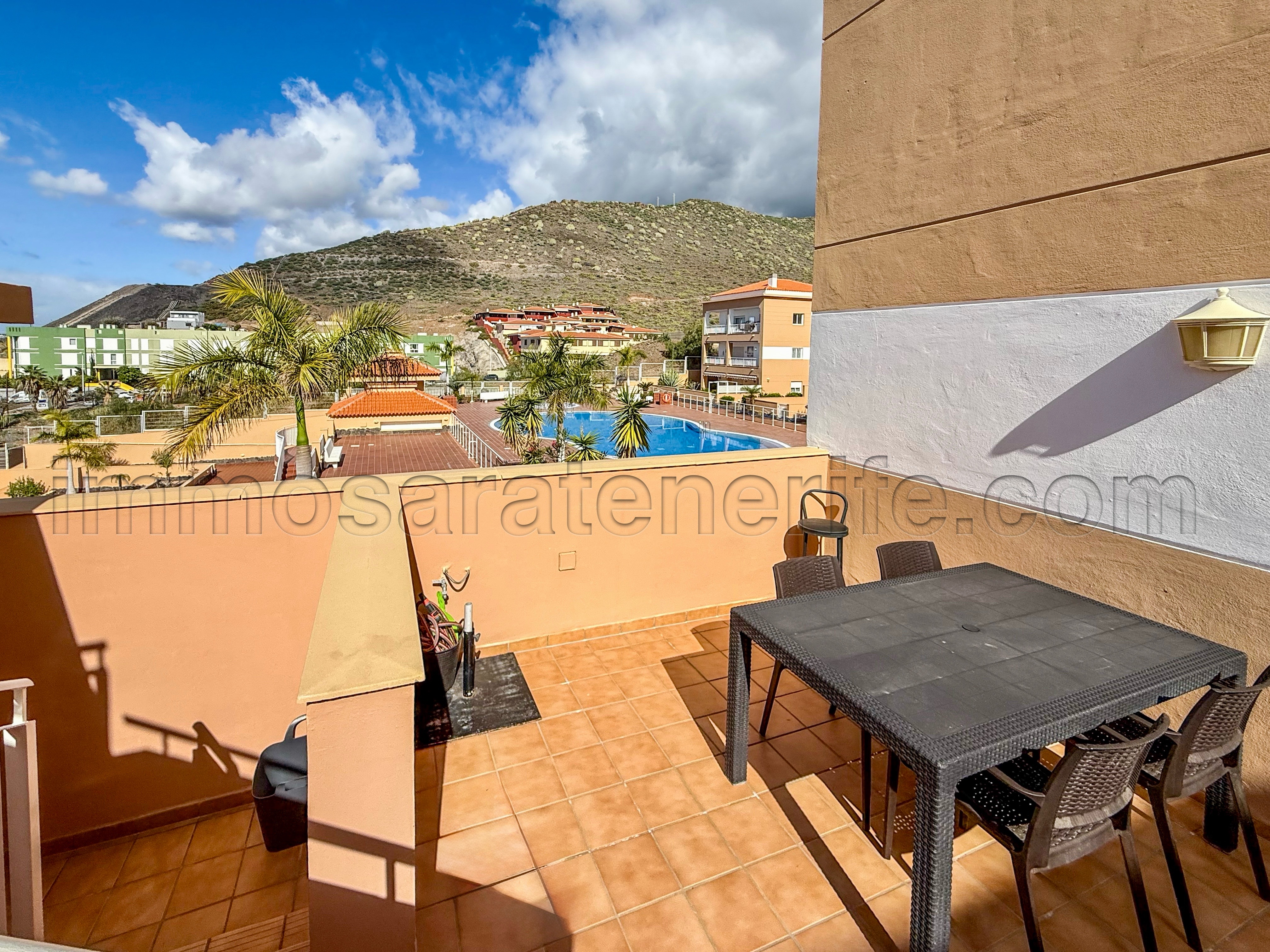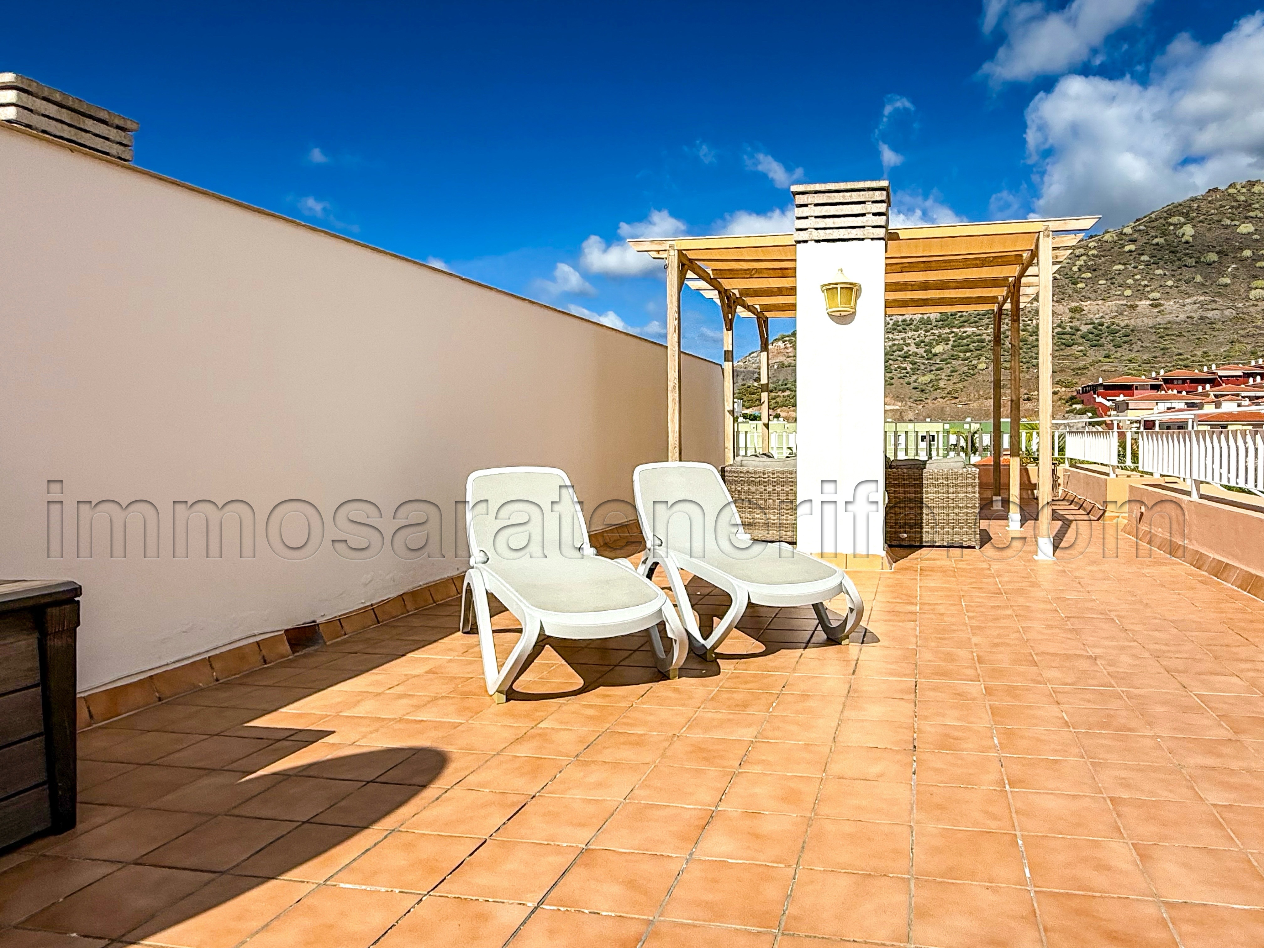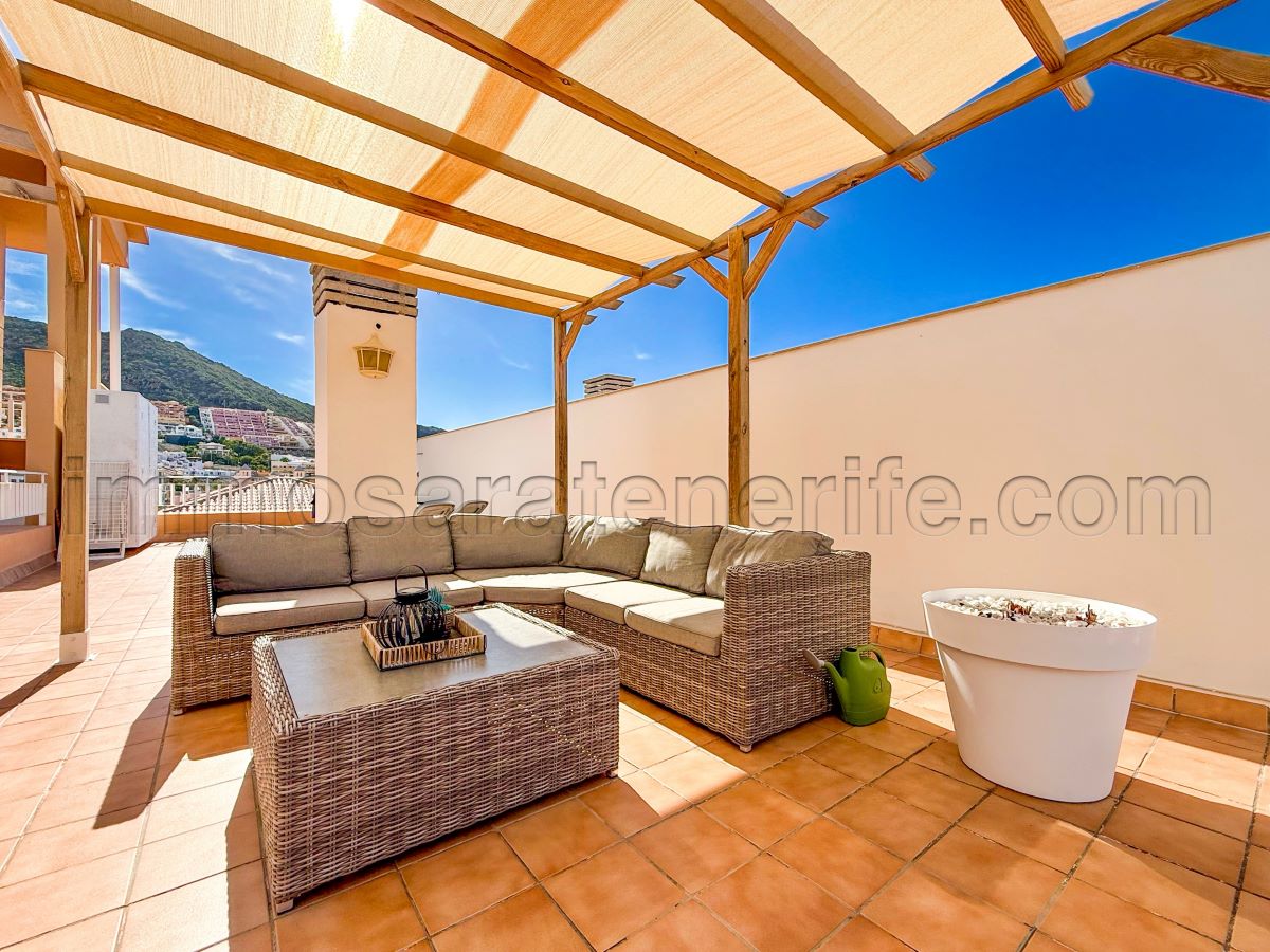 Het appartement beschikt over twee terrassen, beide met zicht op het zwembad: er is een terras van ongeveer 20m2 en een ruim dakterras van circa 60 m², vanwaar men bovendien zeezicht heeft.
