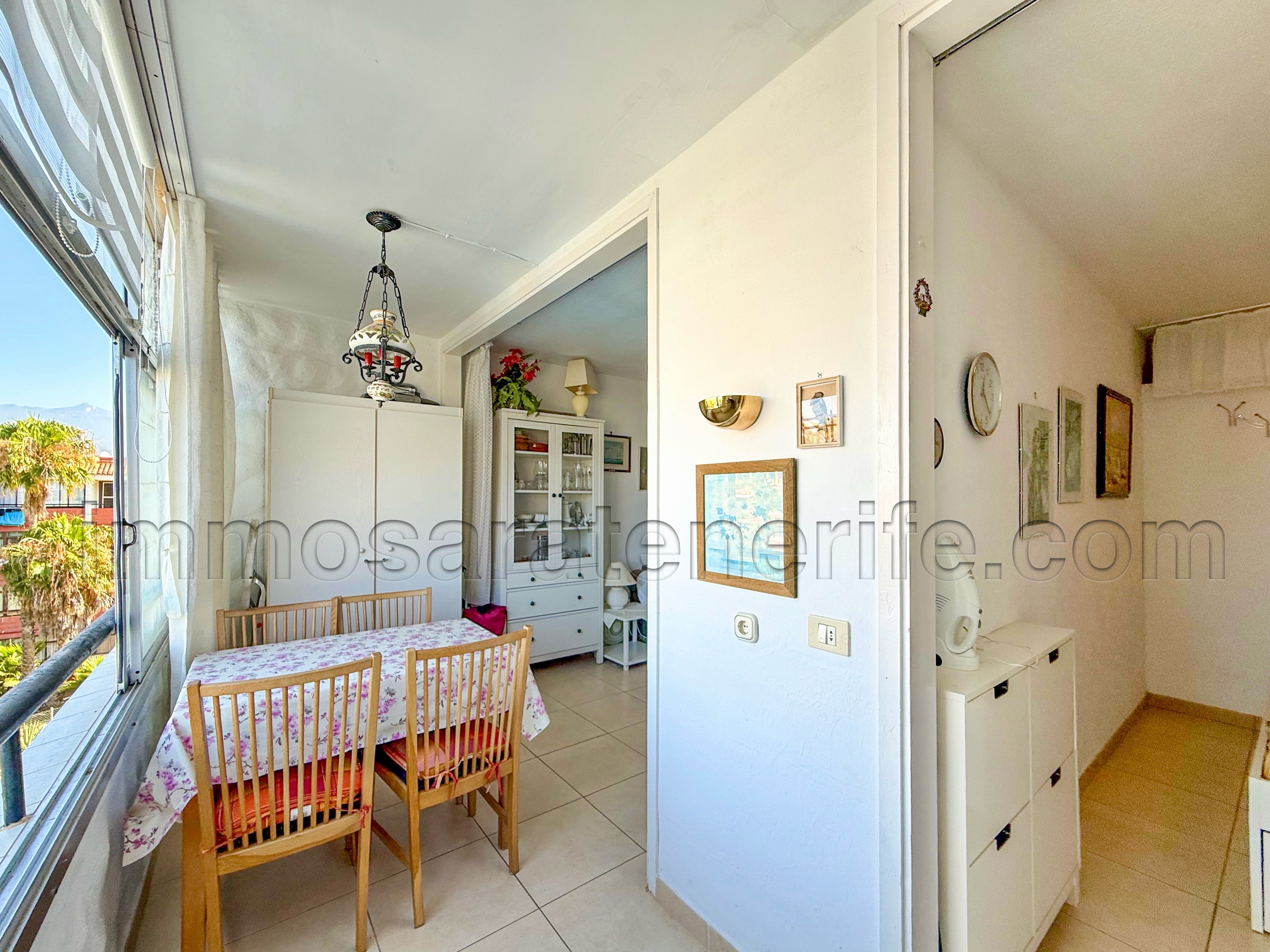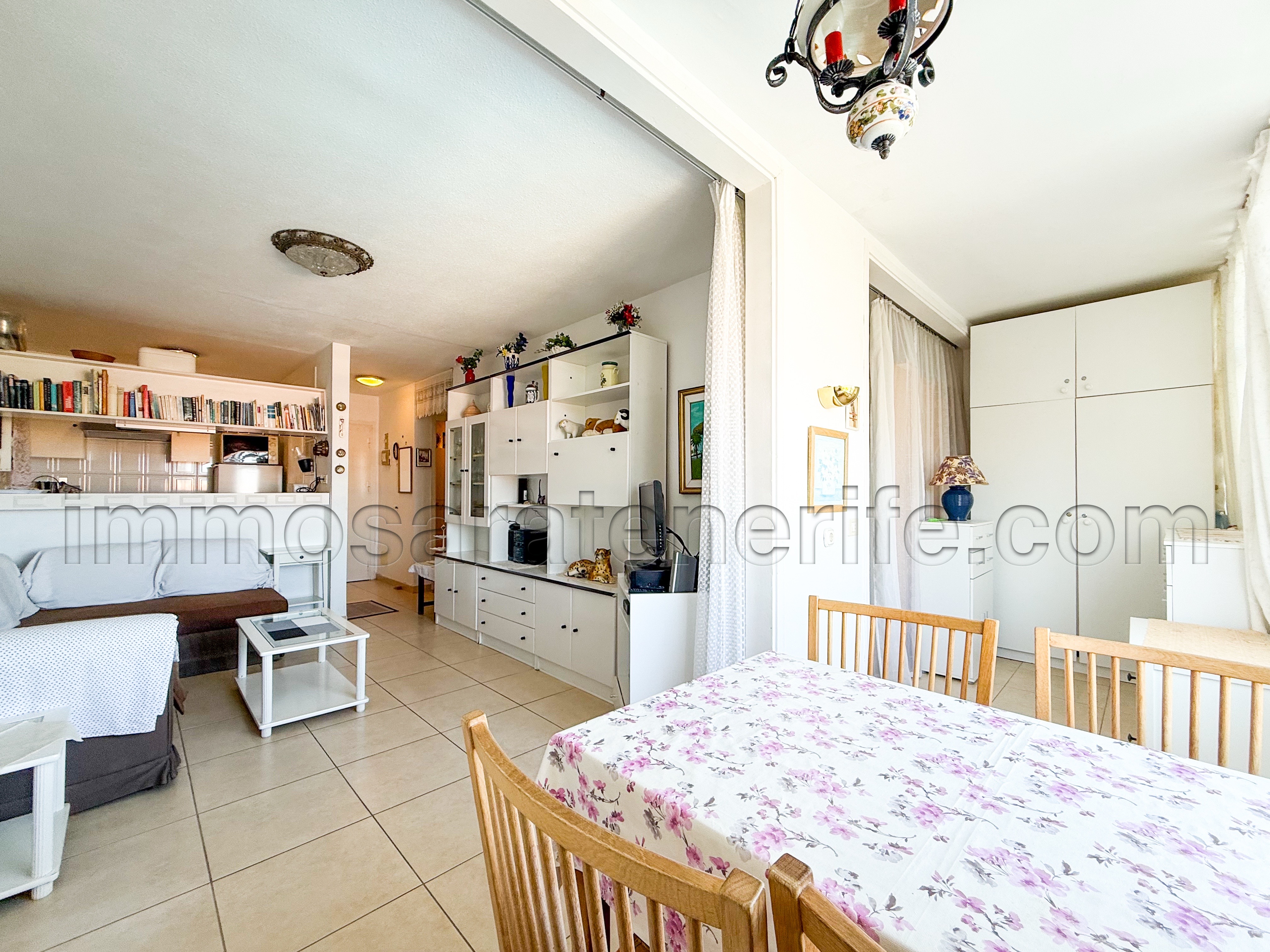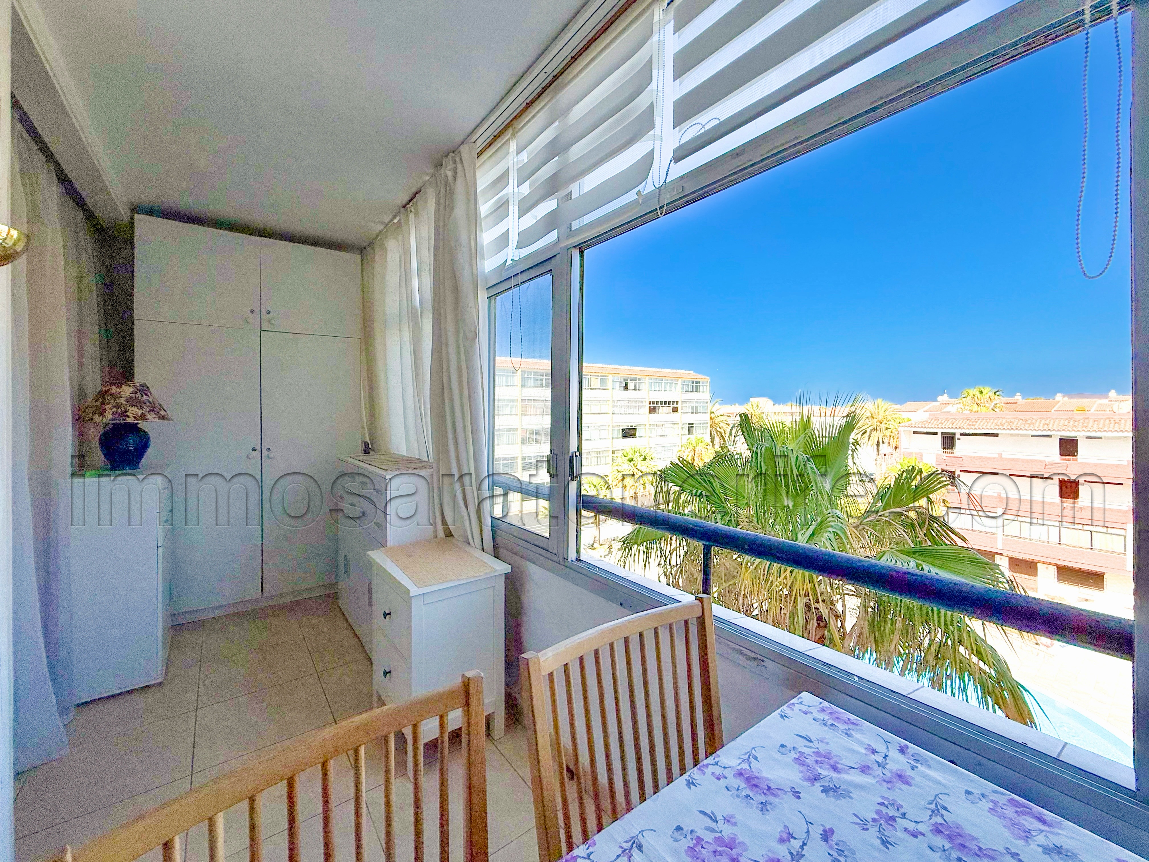 The living-room and the bedroom, are both giving out onto the closed terrace overlooking the pool.